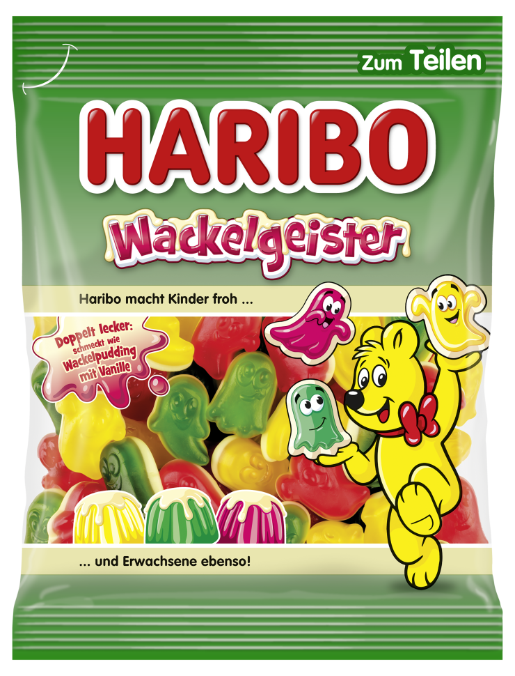 Gänsehaut gefällig? Die HARIBO Wackelgeister sind gleich doppelt lecker und schmecken nach den drei beliebten Wackelpudding-Sorten Waldmeister, Himbeere und Zitrone, die jeweils mit einem fluffigen Vanilleschaum kombiniert werden. Die kleinen Geister sorgen jederzeit, daheim und unterwegs, für helle Begeisterung. Buh!